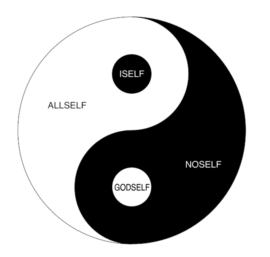The symbol reveals a beautiful truth: the Iself (black dot) and Noself (black field) are the same essential substance – individual consciousness and emptiness sharing the same mysterious nature. The Godself (white dot) and Allself (white field) are also the same substance – divine presence and universal awareness expressing the same luminous reality. What appears as opposites are actually intimate expressions of the same fundamental essence.