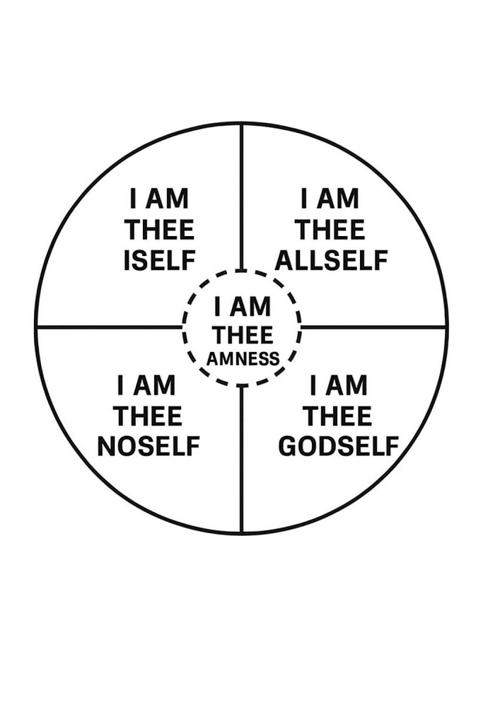 The Self Realization Mantra, “I am thee Iself. I am thee Allself. I am thee Godself. I am thee Noself.” corresponds directly to the consciousness fields mapped in the diagram, providing a practical invocation for recognizing the universal Self through its various modes of experience.