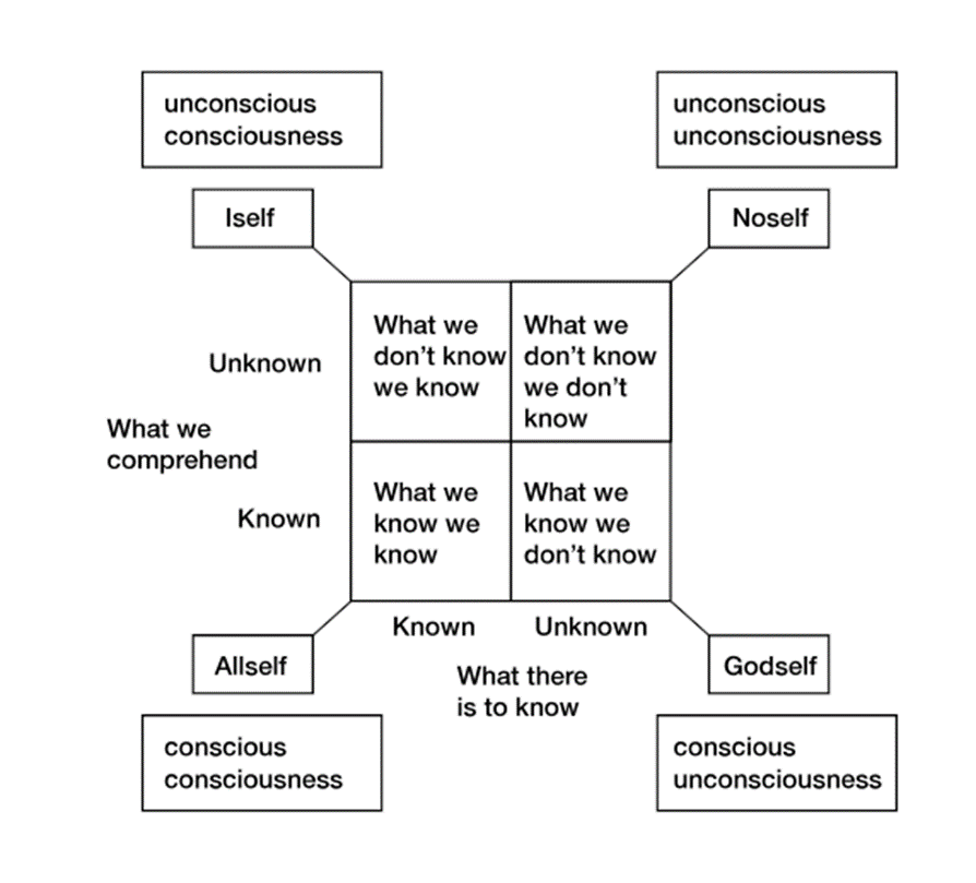 Consciousness has 4 distinct aspects, and these four aspects are the answer to the question “Who am I?” You are the Iself (unknown known), the Allself (known known), the Godself (known unknown), and the Noself (unknown unknown).