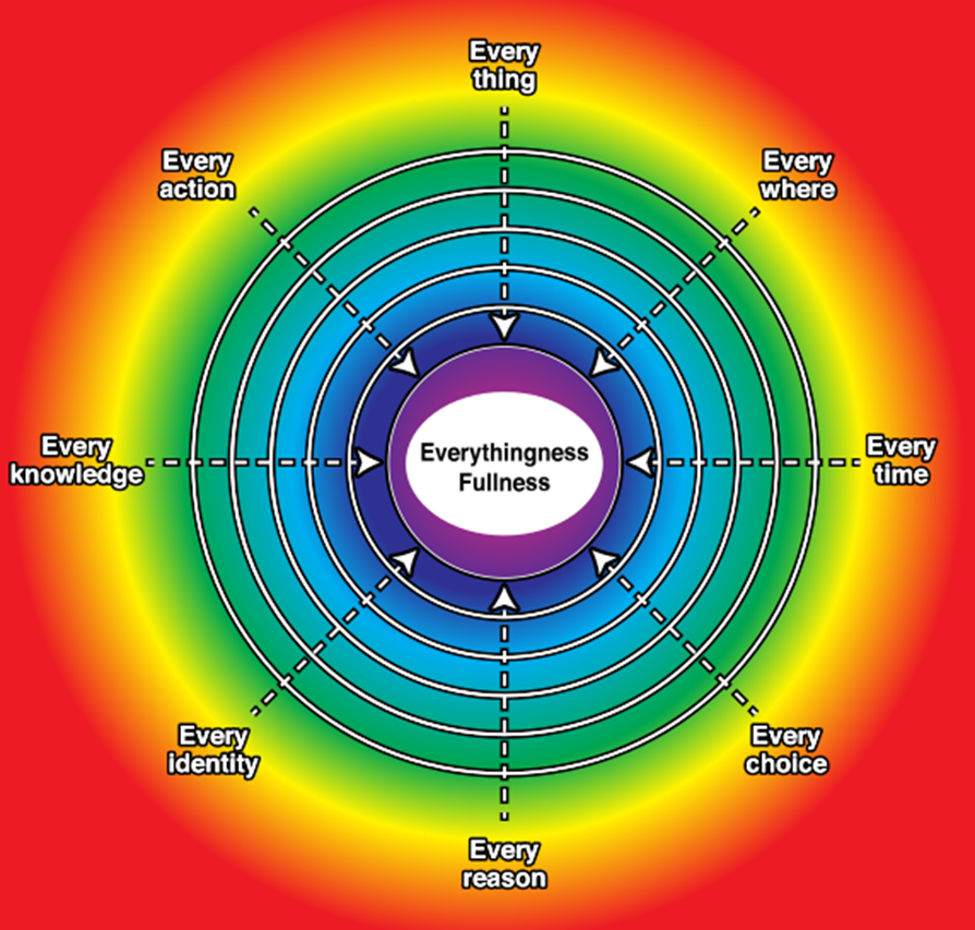 In the context of this mantra, the Allself is the universal self or cosmic consciousness. The Allself is the everywhere, the everywhen, the everything, and the everybody. The Allself is the cosmic consciousness that is busy being everybody doing everything, including being “you.” We are not separate from the universe within which we find ourselves. We are all connected to each other, and we are all connected to the singular field of consciousness that permeates all of creation. The Allself is eternal and unchanging. The Allself is the known known aspect of consciousness, also known as the Everythingness. Everythingness is the vast multiplicity of all that exists – every person, object, experience, and phenomenon that makes up the infinite diversity of manifest reality. Fullness is the complete, undifferentiated wholeness of universal consciousness that contains and expresses itself as all possible experiences, forms, and manifestations simultaneously.